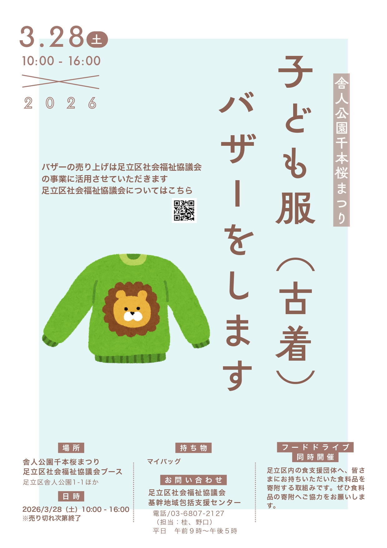 3月28日(土)に、舎人公園千本桜まつりで子ども服(古着)バザーを行います。