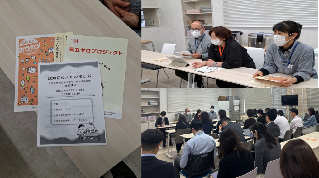 みずほ銀行千住支店にて、接遇向上の一環として、地域包括支援センター千住本町による認知症理解のための出前講座が実施されました。同支店では日頃から高齢者疑似体験を行うなど、高齢者の方への対応力向上に取り組んでいます。