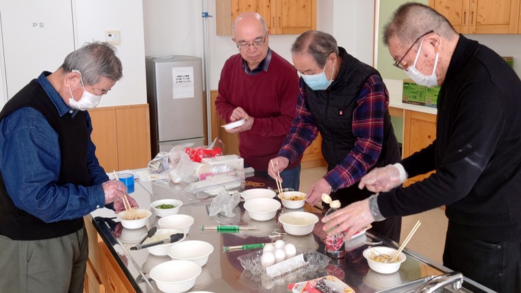調理後は、お楽しみの食事タイム。自然と会話も弾み、笑い声であふれていました。男の健康クラブ~日・東・旭~は、毎月第4金曜日の午前11時30分から、千住東住区センターで活動しています。ぜひ、ご参加ください。(2026年1月23日)