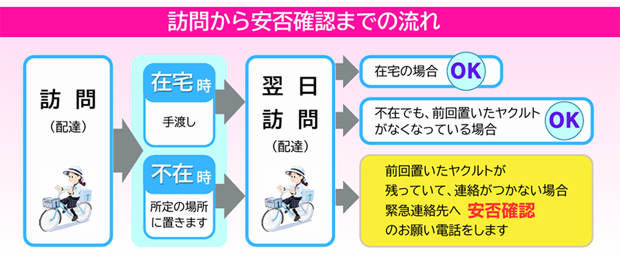 70歳以上のひとり暮らしのお宅を訪問し、乳酸菌飲料を手渡しすることで安否確認を行うとともに、孤独感の緩和に役立てることを目的としています。